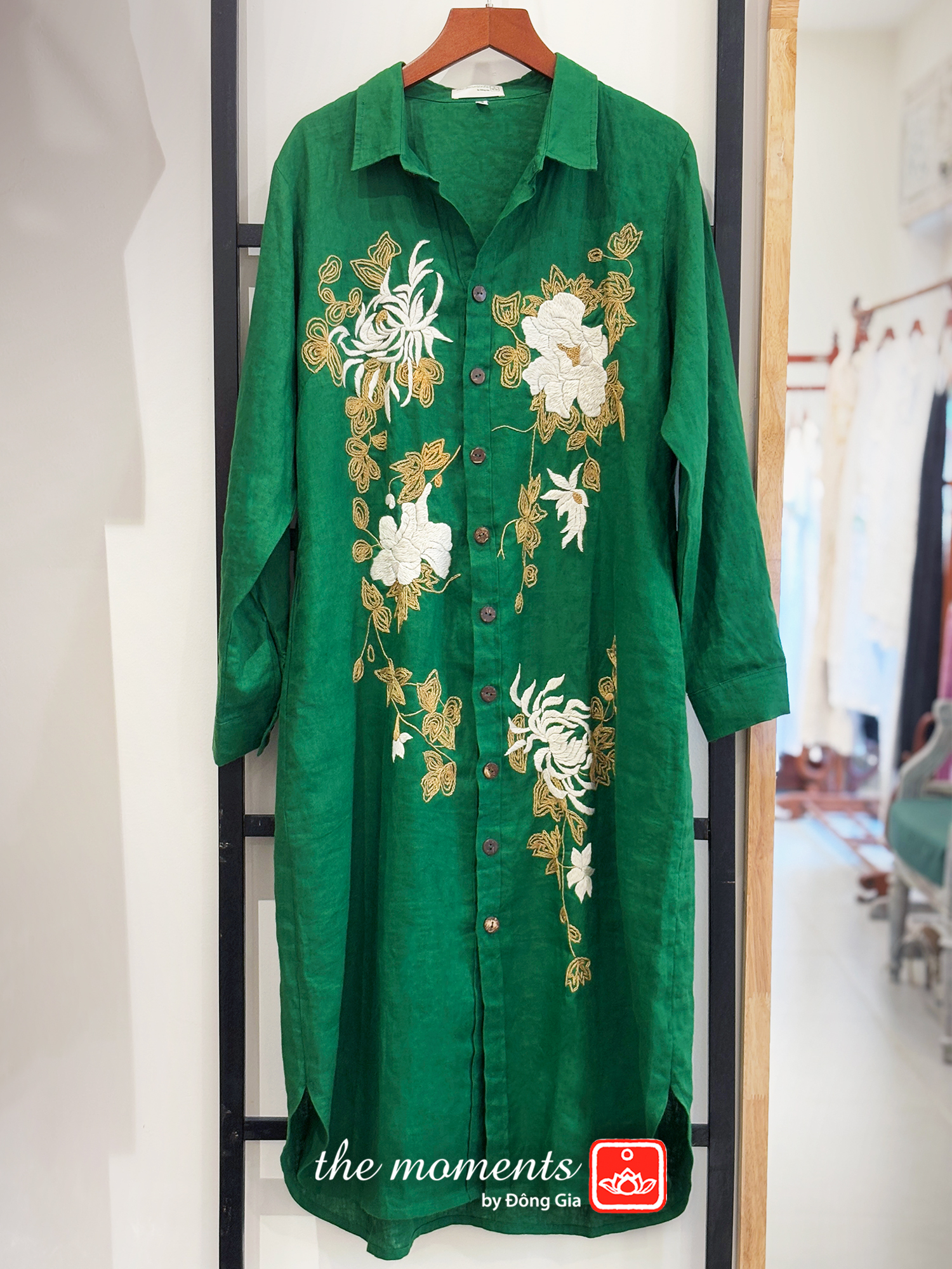 Mang vẻ đẹp dịu dàng và thanh lịch, Đầm sơ mi thêu hoa cúc đến từ BST Cúc Thu là sự kết hợp hoàn hảo giữa thiết kế cổ điển và hơi thở hiện đại. Từng cánh hoa được thêu tay tỉ mỉ trên nền vải linen tưng cao cấp, tạo nên một tổng thể hài hoà, vừa nhẹ nhàng, vừa quý phái. Thiết kế sơ mi dài thanh thoát cùng chi tiết thêu hoa cúc điểm xuyết mang lại cảm giác vừa gần gũi, vừa sang trọng, tựa như một bản giao hoà giữa thiên nhiên và con người.