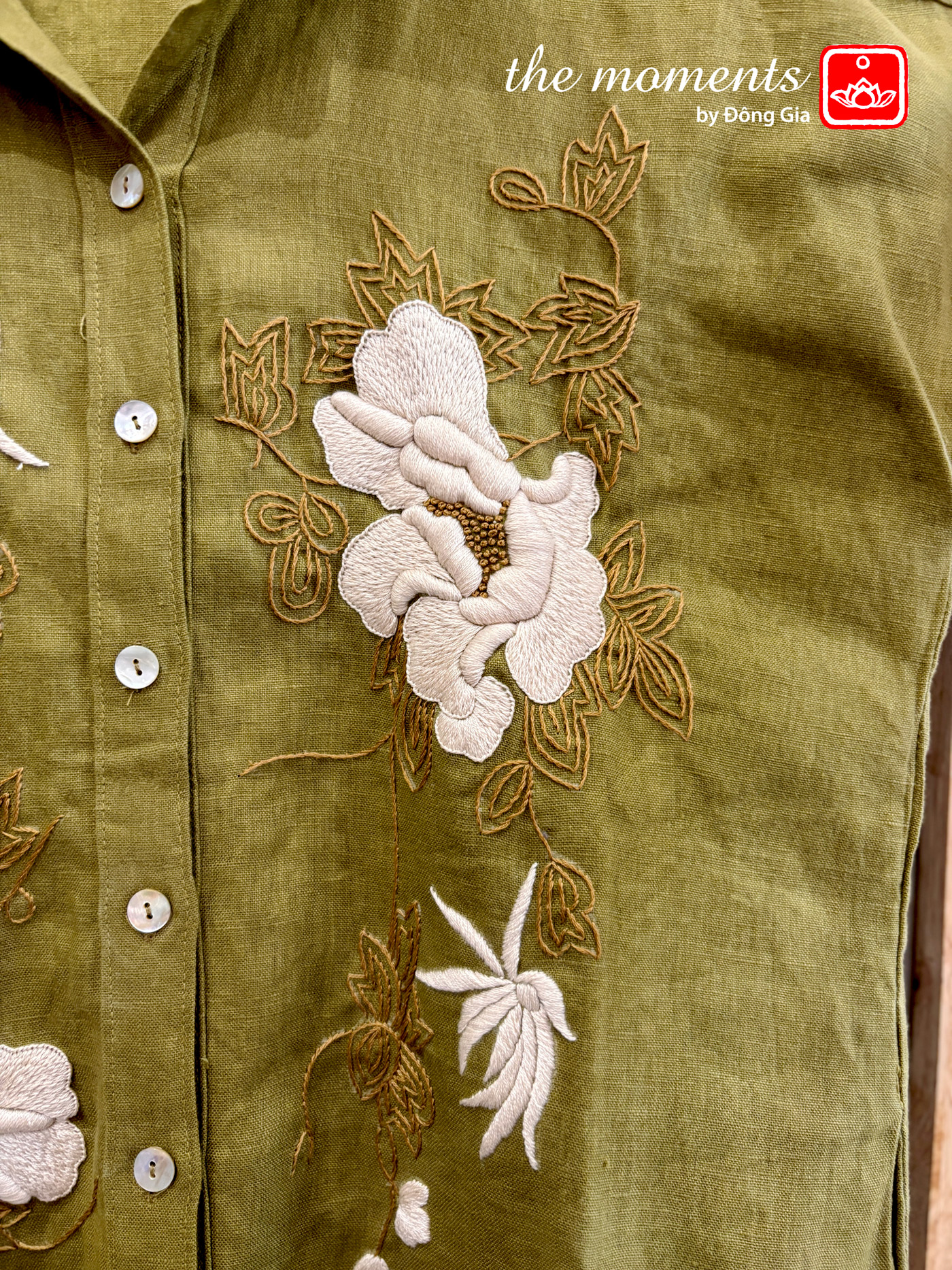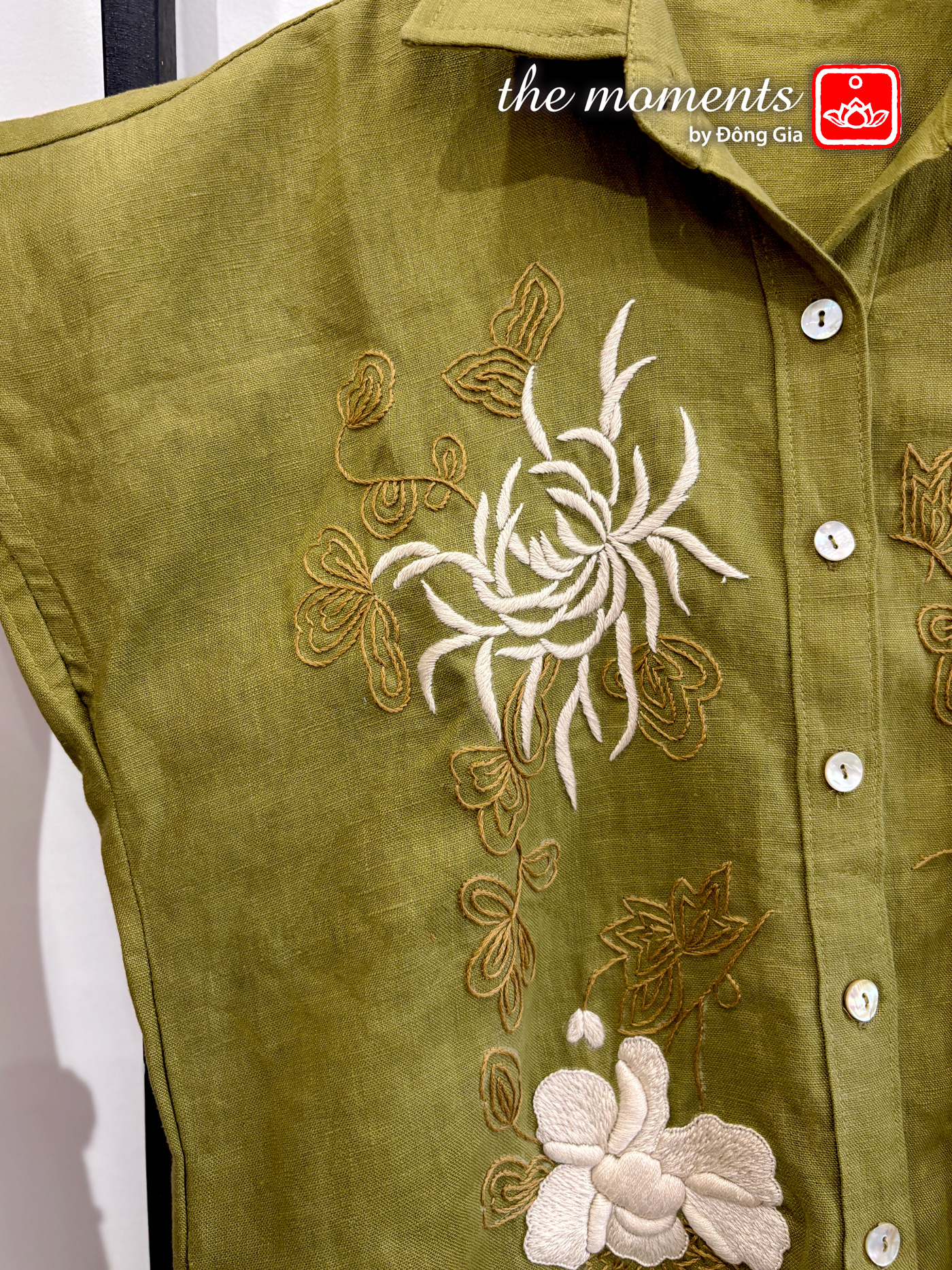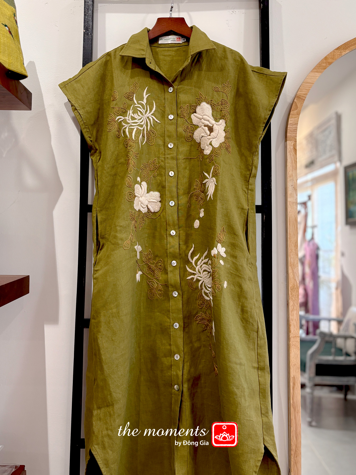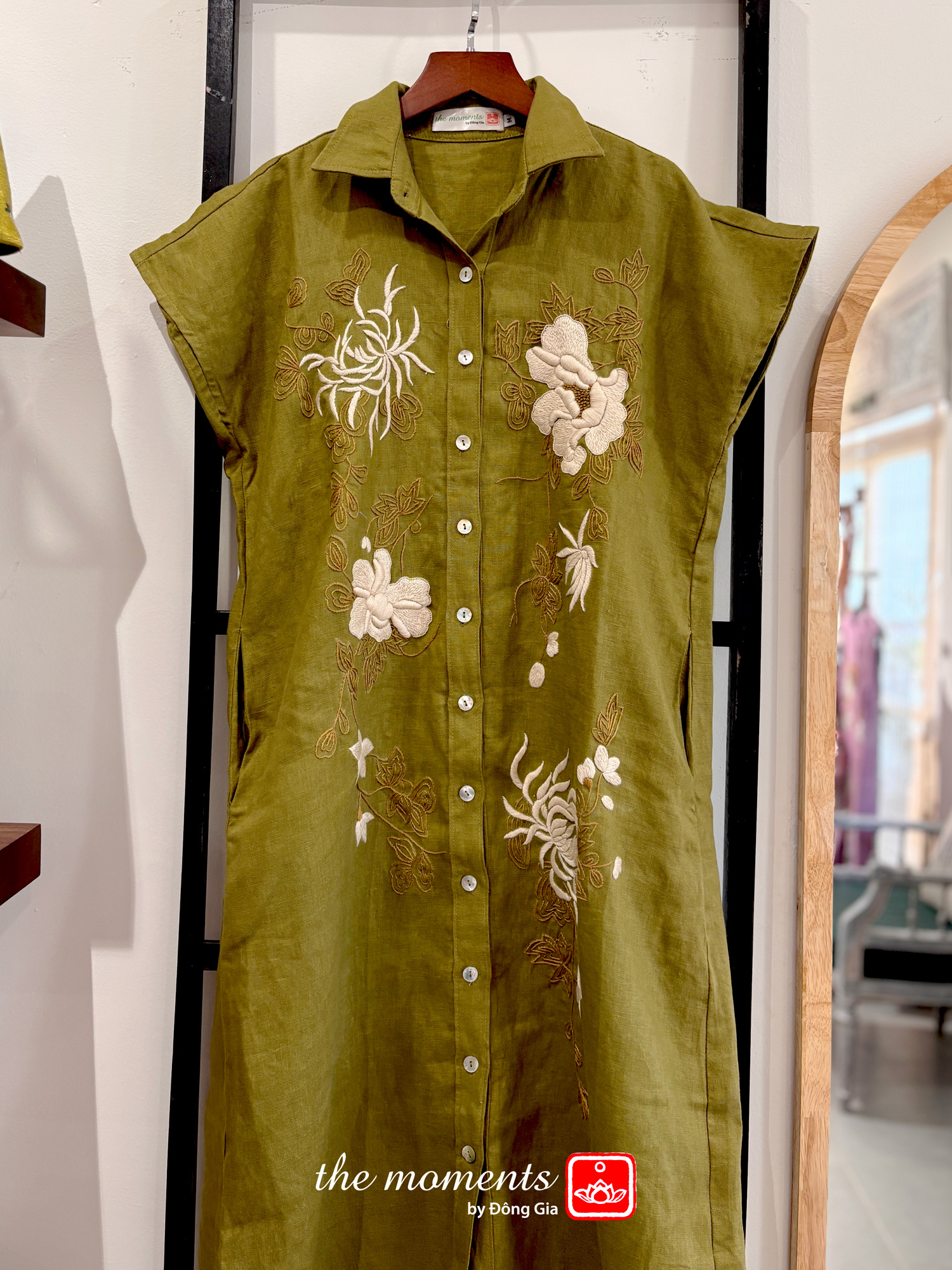 Đầm tay hến thêu hoa cúc - Xanh rêu